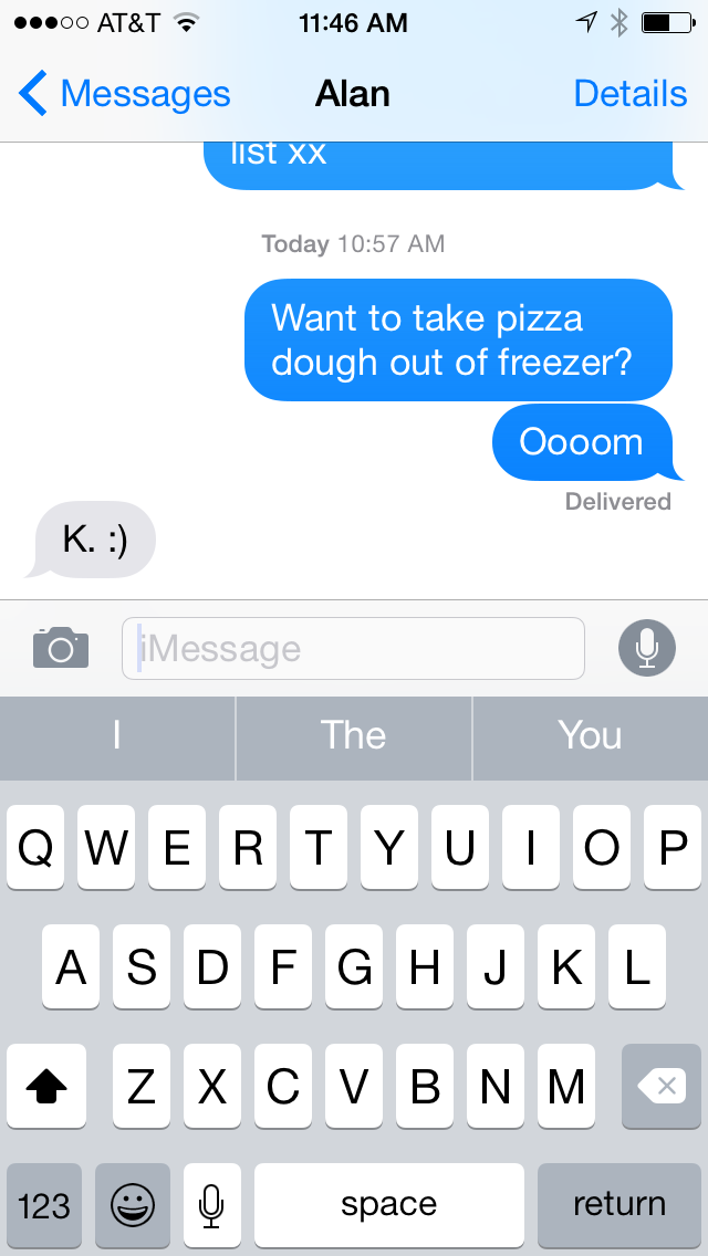 After breakfast today, I left Alan working on a crossword puzzle in the living room and went upstairs to practice yoga. My hope was to spend a few moments in stillness before my practice, trying to connect to that sense of greater awareness. As I sat in easy pose, I thought “I like contemplating the yoga sutras, it gives me a certain sense of something greater and bigger then my day-to-day worries”. Midway into my practice, however, I suddenly found myself thinking about what Alan and I would have for dinner. Apparently stillness of mind is, for now, mostly just an ideal. I could not resist picking up my phone and texting him with the suggestion that we should have pizza for dinner. I heard my text “ping” on his phone downstairs in the living room. How ridiculous!